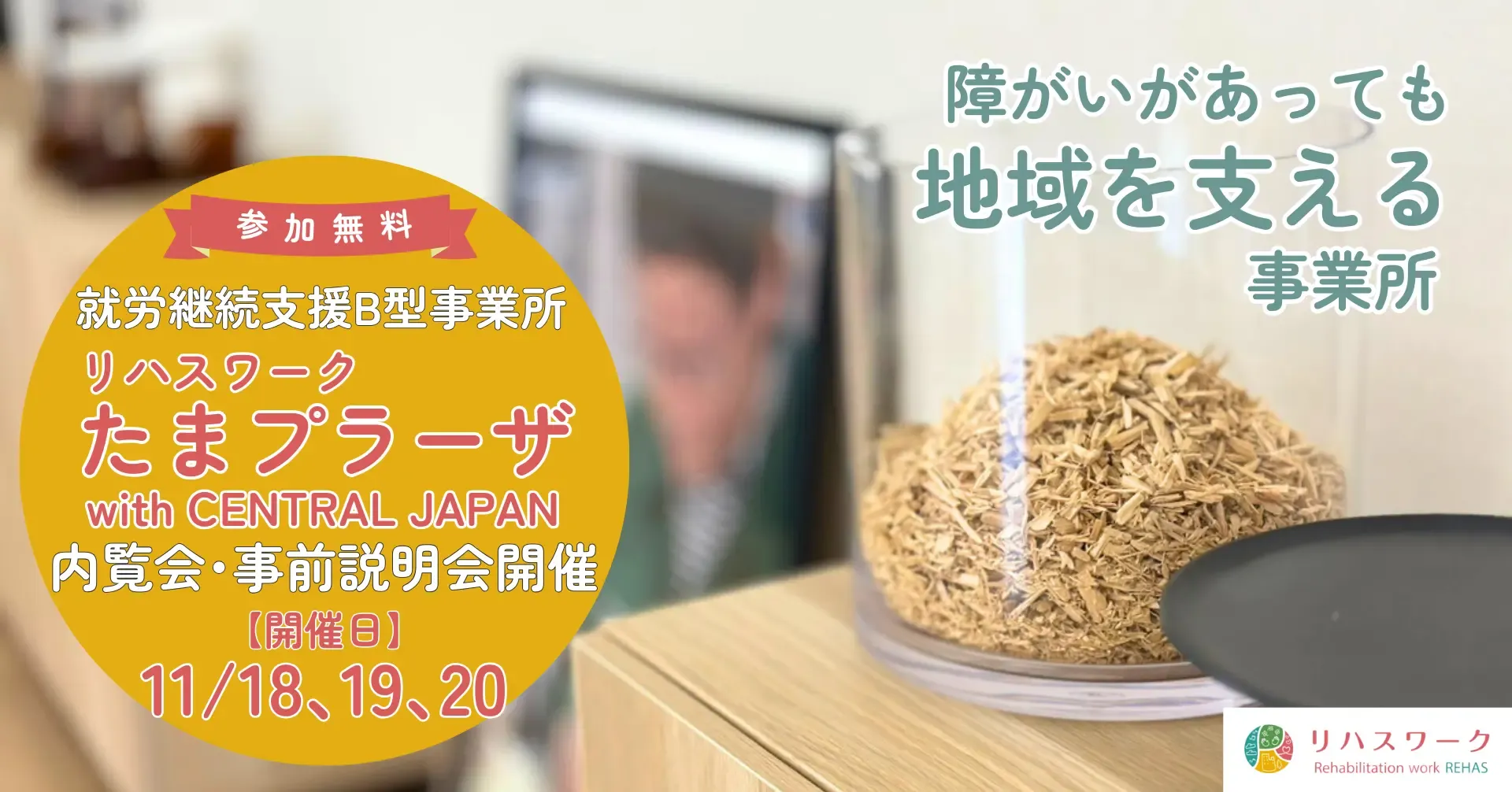 当日は、リハスワーク蕨の経験豊富な医療・専門職社員が事業所の紹介やリハスワークを利用されている事例の紹介を行います。また、自社オリジナル商品の木の商品(木の葉書、栞、チップ)づくりの体験も行うことが出来ます。